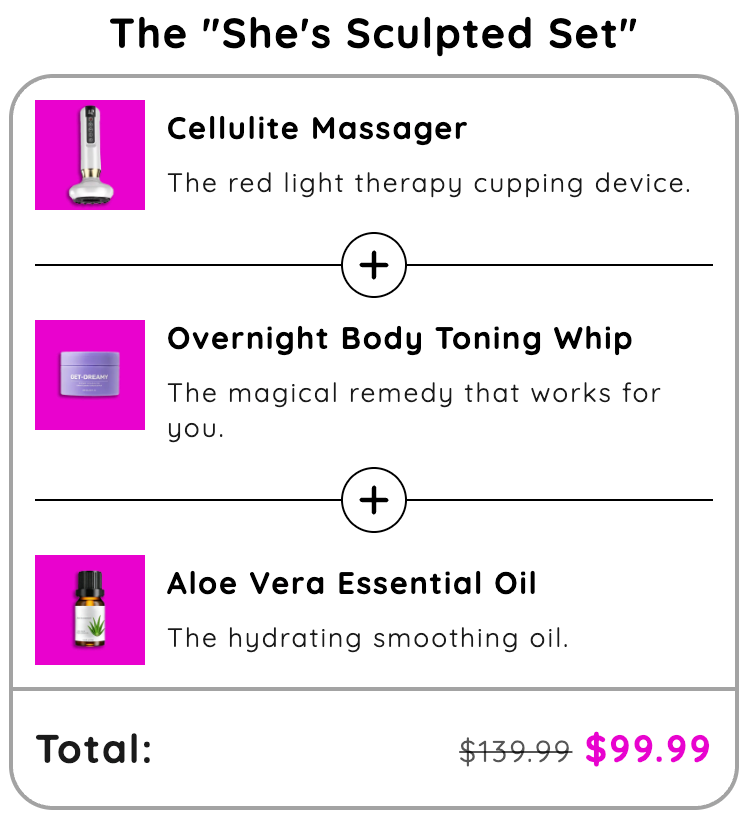 The set gives you a full solution and routine for stubborn cellulite and fat on any part of your body.