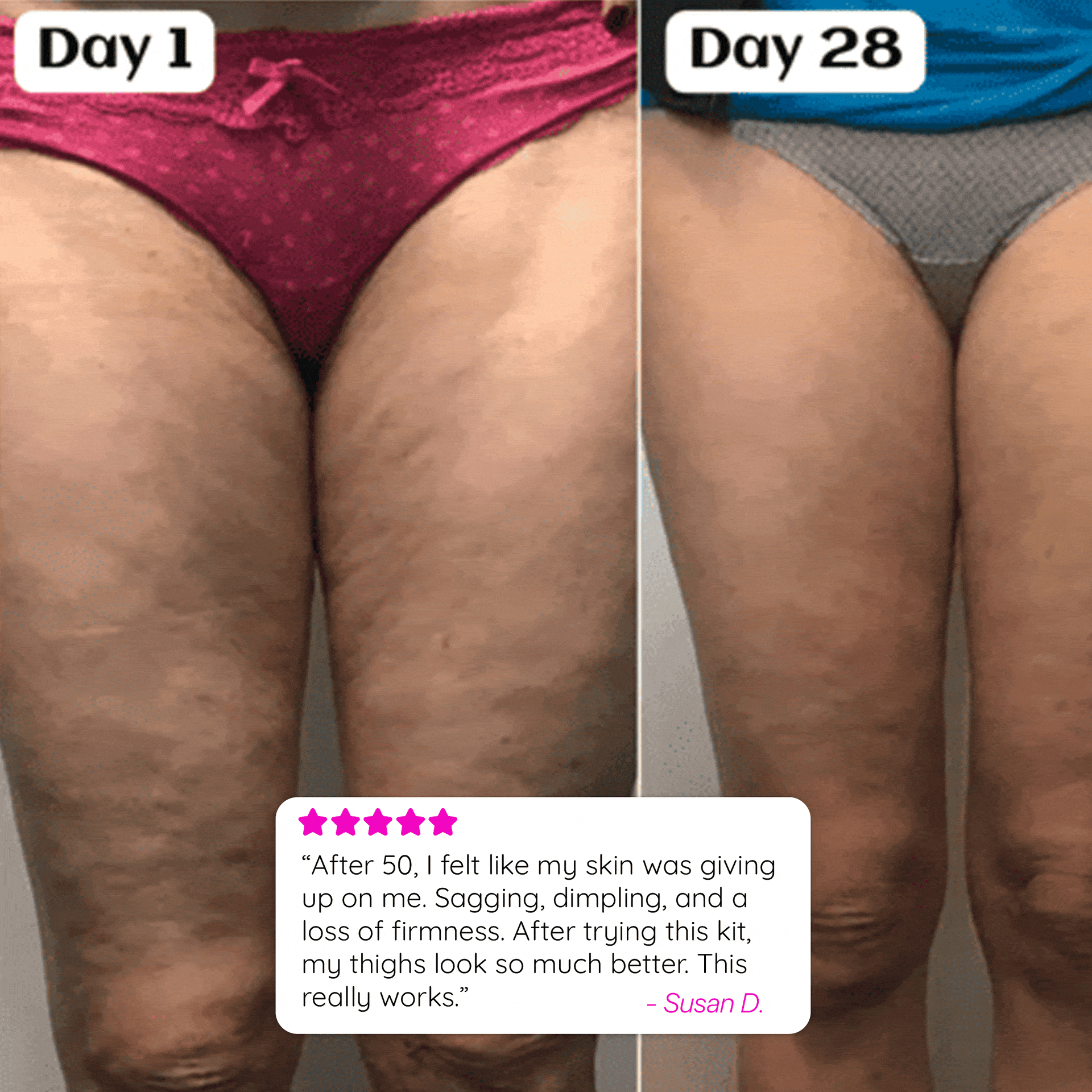 Your skin will feel tighter after the first session. Most women report visible improvement in cellulite appearance within 7 days. By day 21, 79% of users experience dramatic reduction in even the most stubborn thigh and buttock cellulite.